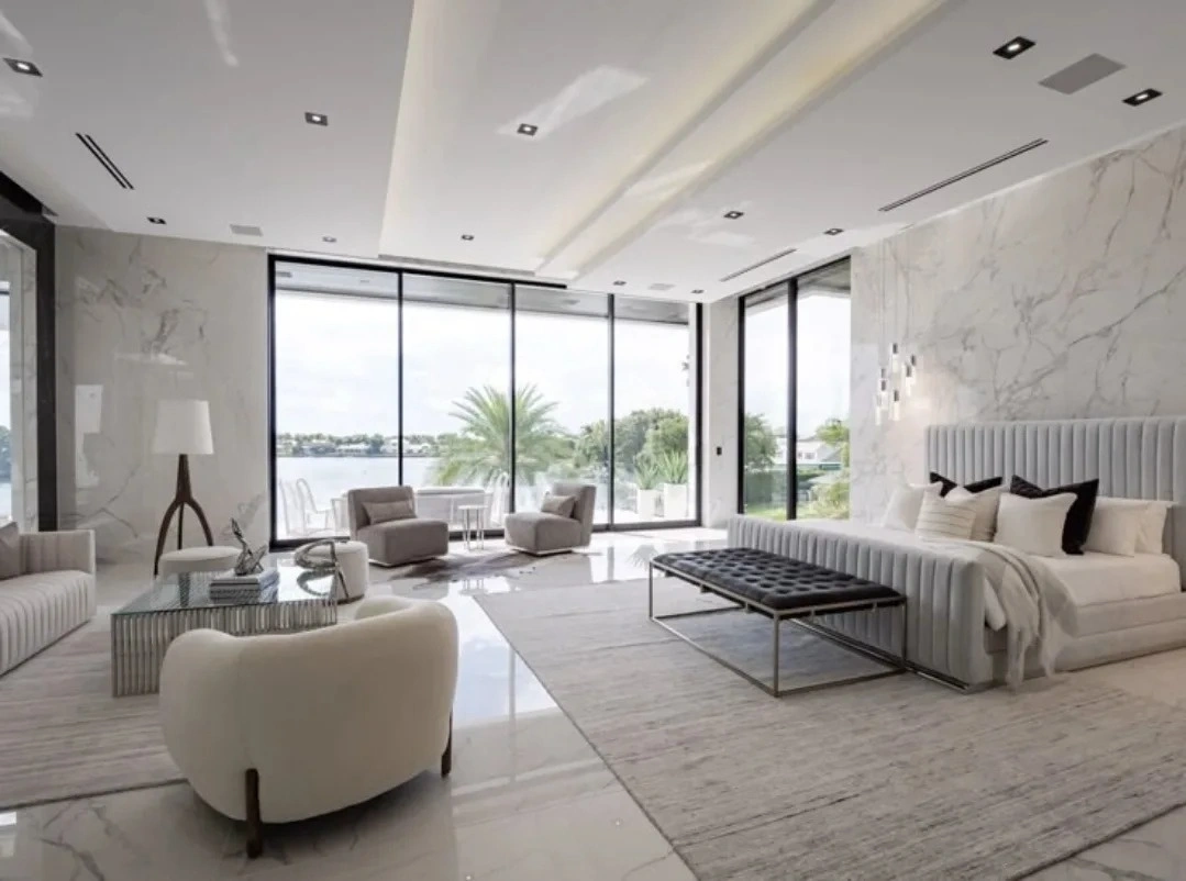 When a large bedroom has a genuinely spectacular view, the design challenge shifts entirely. Everything inside the room must step back so the view can step forward. And yet stepping back does not mean doing nothing. It means choosing materials and forms that are beautiful in their own right while remaining visually quiet enough to let the exterior do its job.White marble on a full accent wall beside the bed provides texture and quiet luxury without color saturation. A channeled velvet headboard in pale gray coordinates with the marble without matching it too precisely, which is always the more sophisticated choice.Floor-to-ceiling glass walls on two sides of the room remove any boundary between the interior and the water and palm landscape outside. In a large bedroom like this, the view is not just a backdrop. It is the primary decoration.White boucle accent chairs, a glass coffee table, and a tufted leather bench at the foot of the bed create zones within the large space without closing it off. The entire room breathes, moves with light throughout the day, and feels like somewhere genuinely extraordinary to wake up.